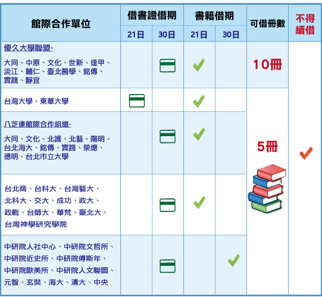 借用人前往合作館時,必須遵守合作館之各項規定,否則取消借閱權利,並通知借用人就讀或服務單位圖書館依相關規定處理。 |